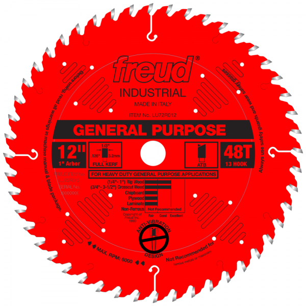 Freuds new General Purpose blade includes a 30 degree Hi-ATB (Alternate Top Bevel) tooth grind for better quality finish and crisper edges in crosscut applications. This blade is ideal for cutting thick hardwoods, softwoods and thinner stock materials that range in thickness from 3/4″ to 3-1/2″ for crosscutting, and 1/4″ to 1″ for ripping. The newly added Perma-SHIELD® non-stick coating protects the blade from heat and pitch build-up, allowing for reduced drag and longer cutting life.